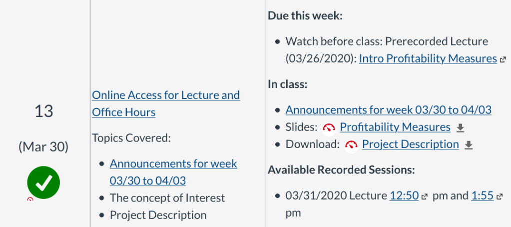 I also added the Pause Icon to indicate the students that we will start a discussion. We use the Zoom chat or microphones to discuss. When there is an awkward silence, I go ahead and use the Poll Feature in Zoom (your can prepare questions ahead of time). Sometimes I use the PowerPoint to do prerecording of the classes using ScreenFlow in my Mac, but my students prefer to meet with me synchronous sessions via Zoom. Every synchronous session is recorded and posted to later to accommodate students that are having any internet connection limitations. This is an example of how I am communicating with my students using the Canvas LMS home page using a table.